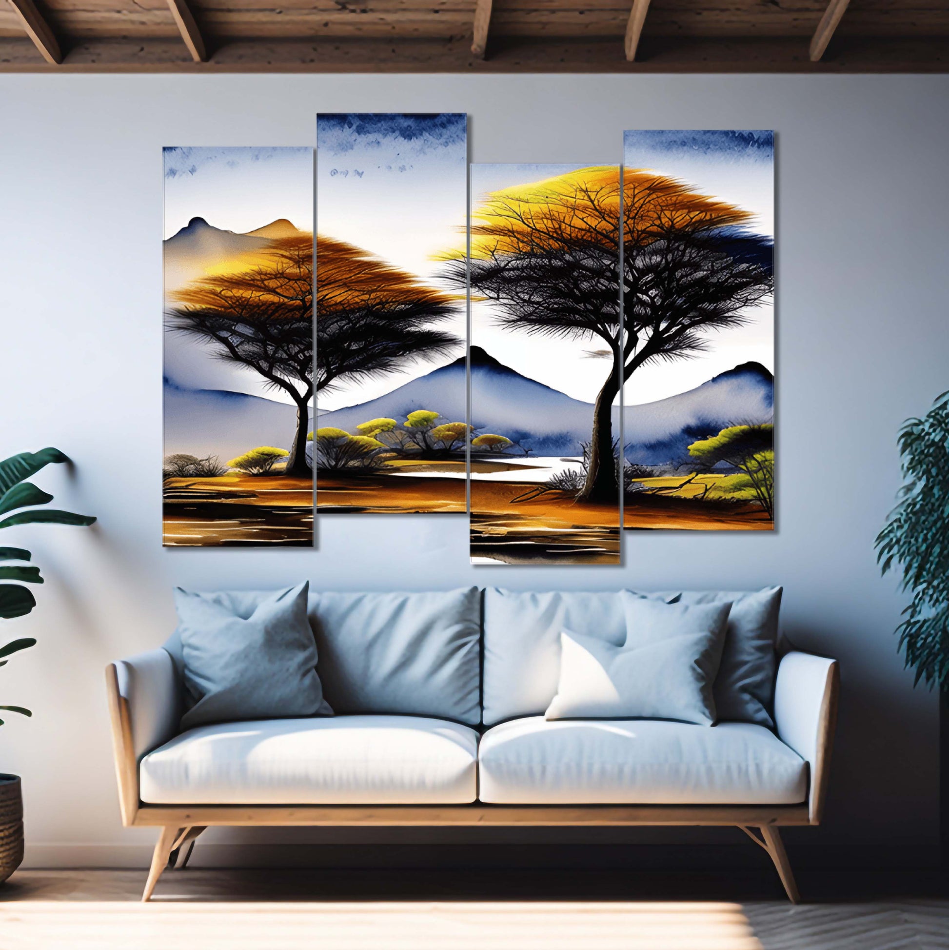 Trees In Mountains Silhouette | Nature Wall Art | 4 Panels